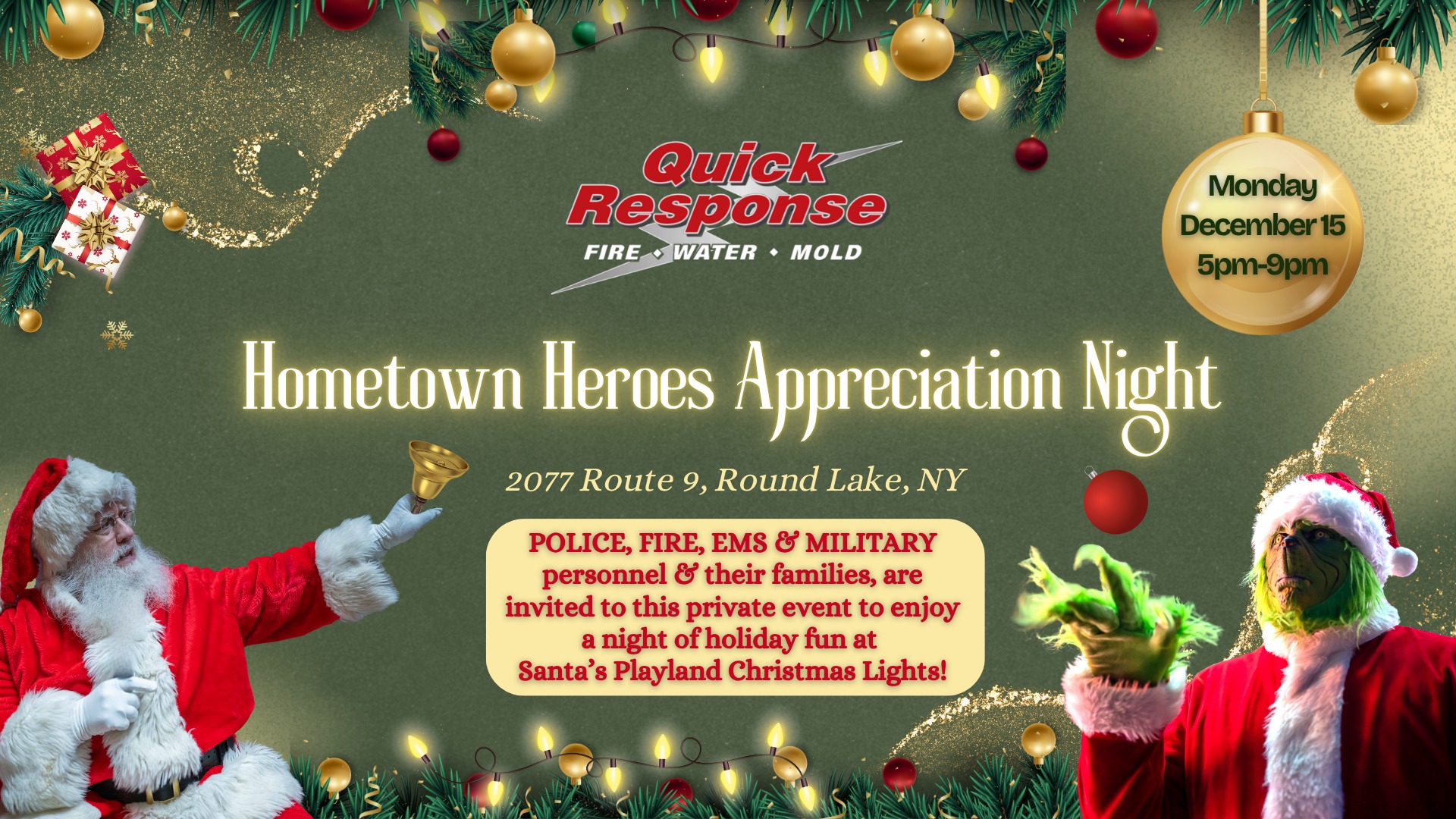 Quick Response 2077 US Route 9, Clifton ParkQuick Response invites our Police, Fire, EMS, and Military Heroes and your families to a private evening of holiday celebration at Santa’s Playland Christmas Lights! It’s our way of saying thank you for all that you do for our community. Enjoy a festive indoor & outdoor experience featuring: A super...